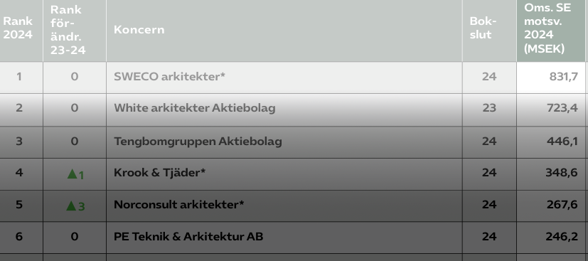 När Innovationsföretagen listar de största arkitektbyråerna i Sverige ligger Sweco i topp, följt av White och Tengbom. Krook & Tjäder går upp på fjärde plats.